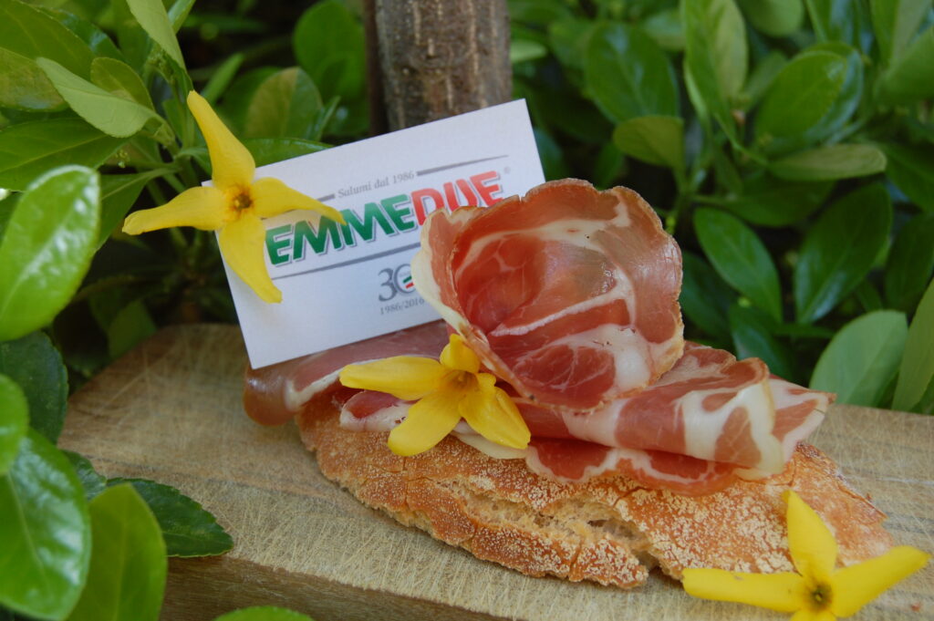 PRODUCTS – Salumi Emmedue offers a wide range of traditional and typical cured meats, 100% made in Italy, gluten-free (included in the book AiC 2018), without GMOs, lactose and milk proteins free. Thanks to a careful selection of raw materials, flavours and spices are carried out in order to combine the balance between an ancient and precious tradition and modern technology. The aromatic plants used as laurel (Laurus nobilis or Lauro) are grown on farmland. Wild fennel (Foeniculum vulgare) is harvested by expert hands in the areas bordering on the farm and only after having passed the rigorous quality controls is used in typical processes such as for example the seasoned sausage. Our production varies from the type of the territory, such as Lucanica sausage, Soppressata, Capocollo, Pancetta and Prosciutto Crudo, to the classics of Italian “salumeria”, such as Naples, Spianata, Ventricina and Milan. In recent years, more and more commercial significance has acquired productions such as Culatta and Culatello and exclusive specialities, patented in the company, such as the Salame Lucanone® and the Dorso dei tre alberi®. The range also includes a line of products without added preservatives.