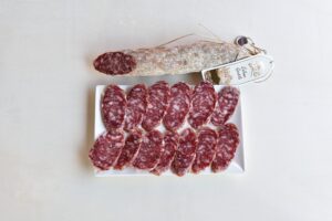 Once this special paste, which is the basis of the fine taste of this product, is ready, it is stuffed into the gut called, in fact, “gentile”, which comes from the rectum intestine of the pig and which is tied by hand using a natural string.