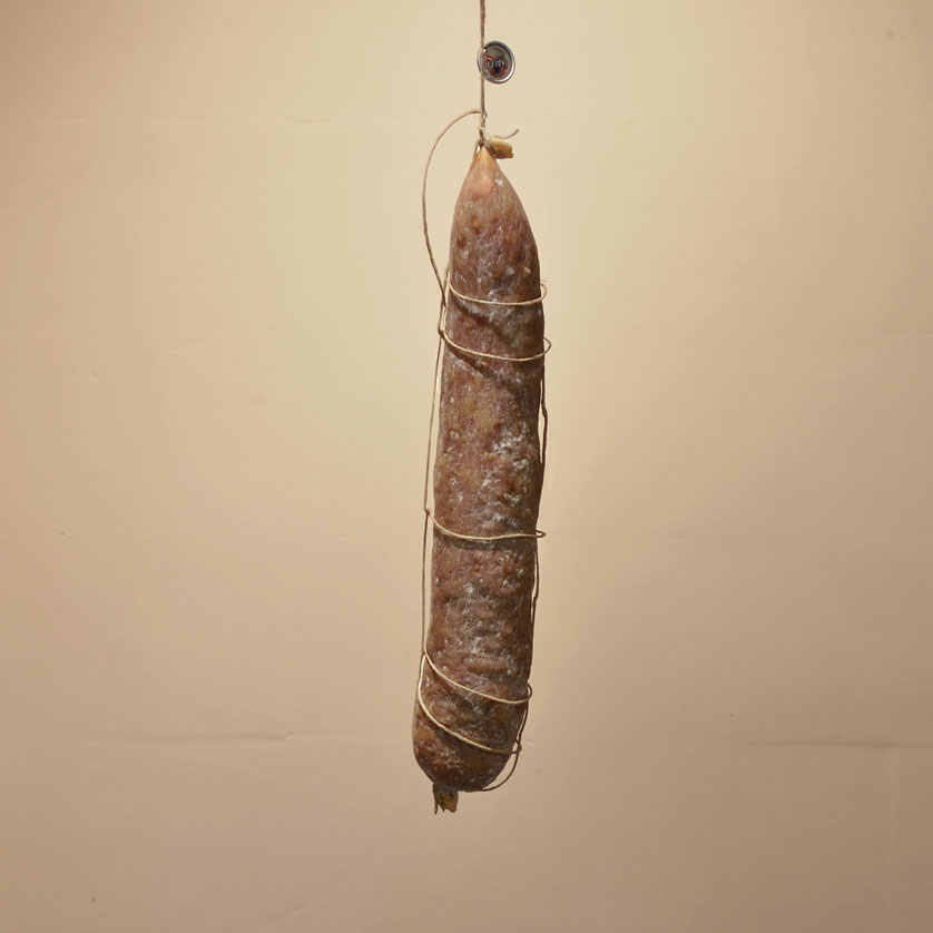 The meat, after being ground to obtain a medium grain, is processed by adding black peppercorns, salt and is flavored with a chopped garlic of the highest quality soaked in wine.